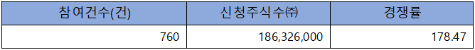 수요예측 참여 건수는 총 760건에 신청 주식수 186,326,000주로 참여 경쟁률 178.47 : 1의 저조한 실적을 기록했습니다.