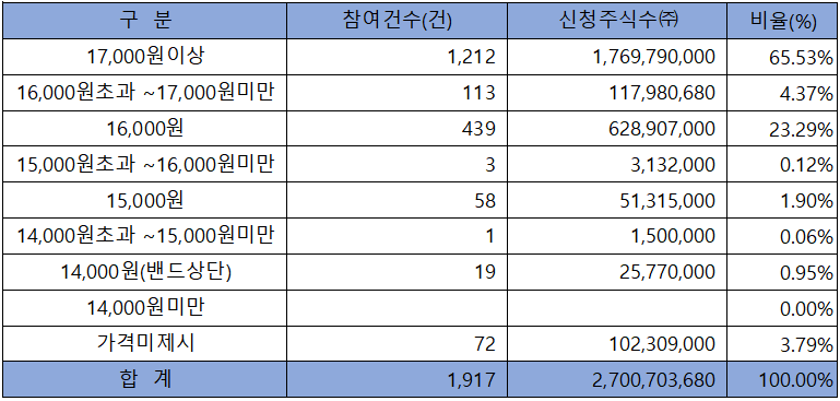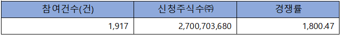 수요예측 참여 건수는 총 1,917건에 신청 주식수 2,700,703,680주로, 참여 경쟁률 1,800.47 : 1의 매우 좋은 실적을 기록했습니다.