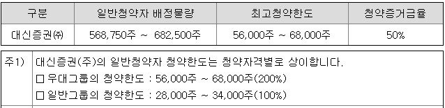 대신증권의 일반 청약자 배정 물량은 568,750주 ~ 682,500주이고, 일반 청약자의 최고 청약 한도는 일반그룹 기준 28,000주 ~ 34,000입니다.
