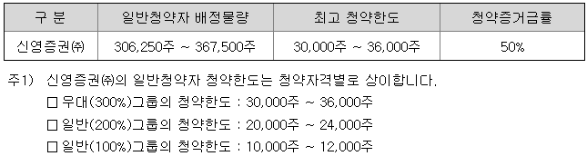 신영증권의 경우 일반 청약자 배정 물량은 306,250주 ~ 367,500주이고, 일반 청약자의 최고 청약 한도는 일반 그룹 기준 10,000주 ~ 12,000주입니다.