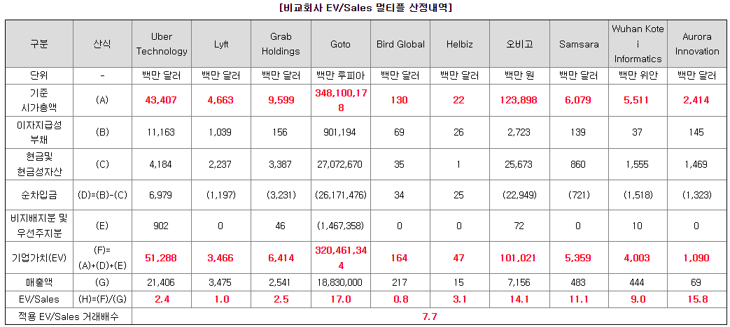 유사회사로는 우버테크놀로지 등 10개 회사가 선정되었습니다.