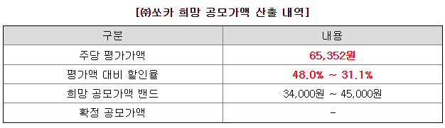 쏘카의 금번 공모희망가격은 회사의 주당평가가액 65,352원에서 31.1% ~ 48.0%를 할인한 가격입니다.