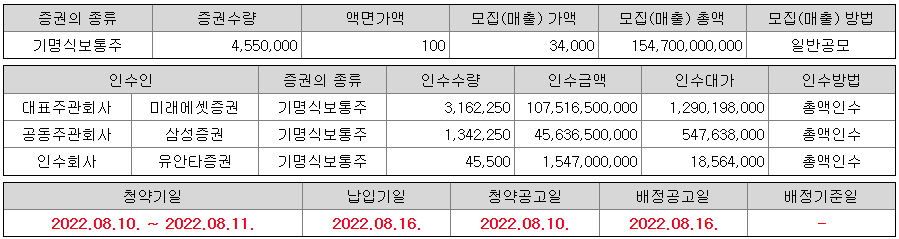 - 공모청약일 : 8월 10일 (수) ~ 8월 11일 (목)