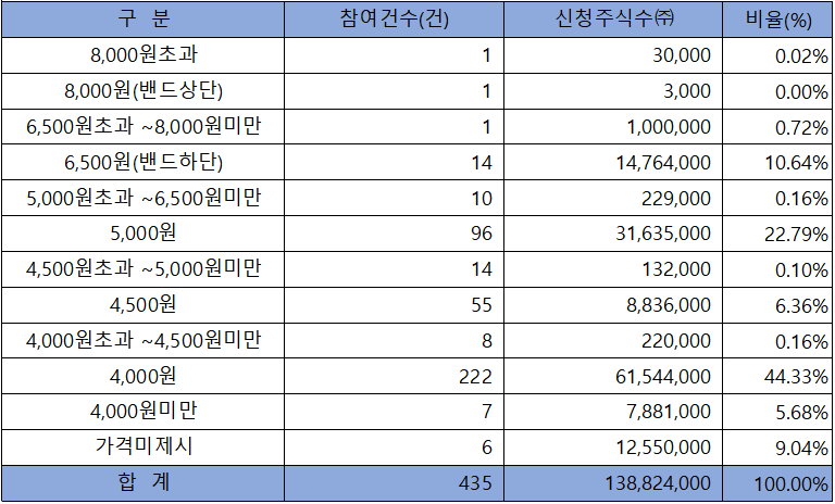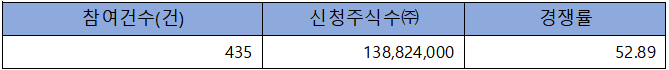 수요예측 참여 건수는 총 435건에 신청 주식수 138,824,000주로, 참여 경쟁률 52.89 : 1의 아주 저조한 실적을 기록했습니다.