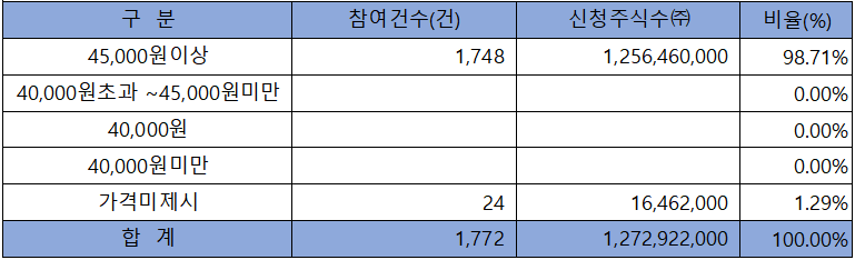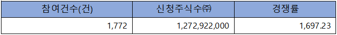 수요예측 참여 건수는 총 1,772건에 신청 주식수 1,272,922,000주로 매우 좋은 참여 경쟁률 실적을 기록했습니다.