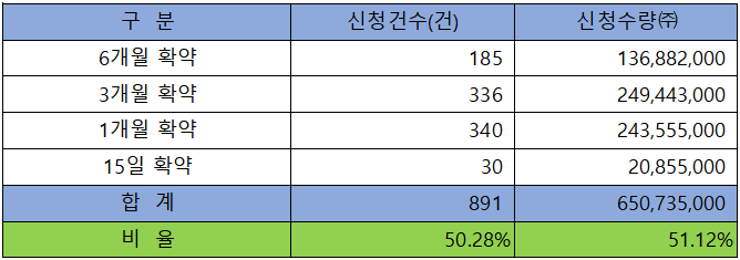 의무 보유 확약 건수는 891건에 650,735,000주로 전체 신청 물량 대비 건수로는 50.28%, 수량으로는 51.12%였으며 15일 확약부터 6개월 확약까지 다양한 분포를 나타냈습니다.