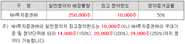 NH투자증권의 일반 청약자 배정 물량은 250,000주이고, 일반청약자 최고 청약 한도는 일반 기준 10,000주입니다.