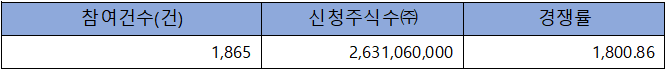 수요예측 참여 건수는 총 1,865건에 신청 주식수 2,631,060,000주로 참여 경쟁률 1,800.86 : 1의 매우 좋은 실적을 기록했습니다.