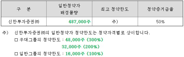신한투자증권의 일반 청약자 배정 물량은 487,000주이고, 일반 청약자의 최고 청약 한도는 일반 그룹 기준 16,000주입니다.