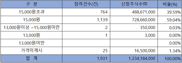 수요예측 참여 건수는 총 1,931건에 신청 주식수 1,234,184,000주로 참여 경쟁률 1,869.47 : 1의 매우 좋은 실적을 기록했습니다.