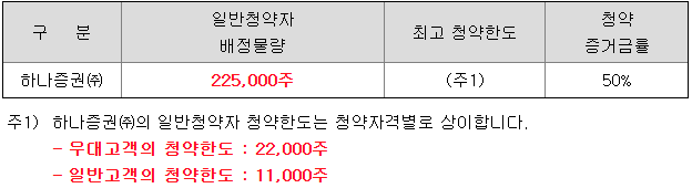 하나증권의 일반 청약자 배정 물량은 225,000주이고, 일반 청약자의 최고 청약 한도는 일반 고객 기준 11,000주입니다.