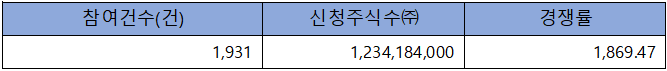 수요예측 참여 건수는 총 1,931건에 신청 주식수 1,234,184,000주로 참여 경쟁률 1,869.47 : 1의 매우 좋은 실적을 기록했습니다.