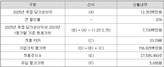 회사의 주당 평가가액은 2025년 추정 순이익을 현재 가치로 할인하여 환산한 후 유사회사의 평균 PER배수를 적용하여 회사 가치를 구하고 이를 주식 수로 나누어 산출한 것입니다.