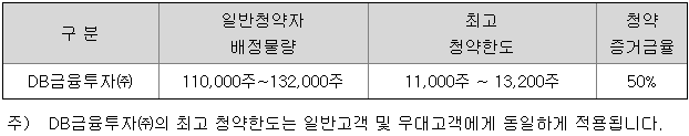 DB금융투자의 일반 청약자 배정 물량은 110,000주 ~ 132,000주이고, 일반 청약자의 최고 청약 한도는 모든 등급의 고객 동일하게 11,000주 ~ 13,200주입니다.