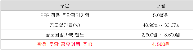 3,600원 이상 제시 가격이 자세하게 공시되지 않아 4,500원으로 공모가를 확정한 배경은 살펴볼 수 없지만 상당히 높은 가격이 제시되었을 것으로 짐작할 수 있습니다.