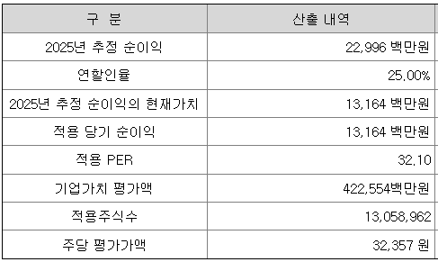 회사의 주당 평가가액은 2025년 추정 순이익에서 출발하여 현재가치로 할인하여 환산한 후, 유사회사의 평균 PER배수를 곱하여 회사 가치를 정하고 이를 주식 수로 나누어 산출한 것입니다.