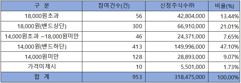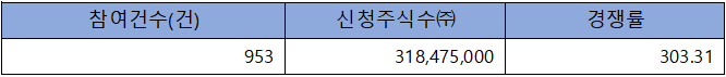 수요예측 참여 건수는 총 953건에 신청 주식수 318,475,000주로 참여 경쟁률 303.31 : 1의 저조한 실적을 기록했습니다.