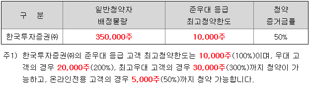 한국투자증권의 일반 청약자 배정 물량은 350,000주이고, 일반 청약자의 최고 청약 한도는 일반 등급 기준 5,000주입니다.