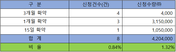 의무 보유 확약 건수는 8건에 4,204,000주로 전체 신청 물량 대비 건수로는 0.84%, 수량으로는 1.32%였는데, 건수나 수량이 적어 의미가 거의 없는 수치입니다.