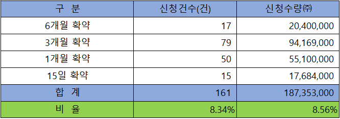 의무 보유 확약 건수는 161건에 187,353,000주로 전체 신청 물량 대비 건수로는 8.34%, 수량으로는 8.56%였습니다.