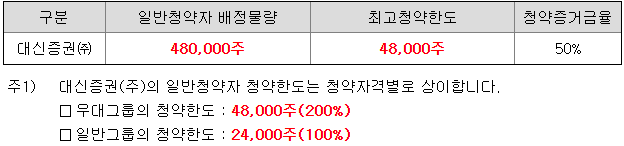 대신증권의 일반 청약자 배정 물량은 480,000주이고, 일반 청약자의 최고 청약 한도는 일반 그룹 기준 24,000주입니다.