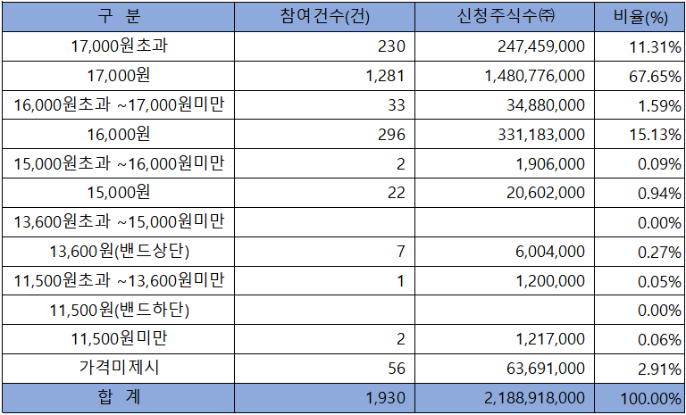 수요 예측 신청 가격 분포는 공모가 상향 조정 이유를 설명하려는 듯 자세하게 공시되었는데, 당초 희망 공모가 밴드 상단 이상 신청 비율이 96.98%에 달했으며, 확정 공모가 16,000원 이상 신청 비율도 95.68%에 달했습니다.