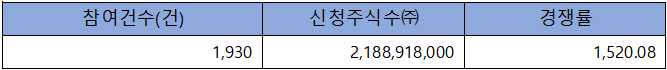 수요예측 참여 건수는 총 1,930건에 신청 주식수 2,188,918,000주로 참여 경쟁률 1,520.08 : 1의 매우 좋은 실적을 기록했습니다.