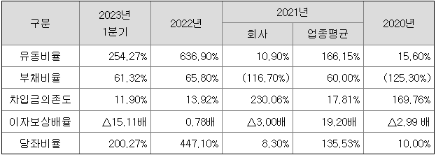 동사의 부채비율은 2022년 전환우선주와 전환사채의 보통주 전환으로 업종 평균 수준으로 회복된 상태이며, 업종 평균 대비 양호한 유동비율을 나타내고 있습니다.