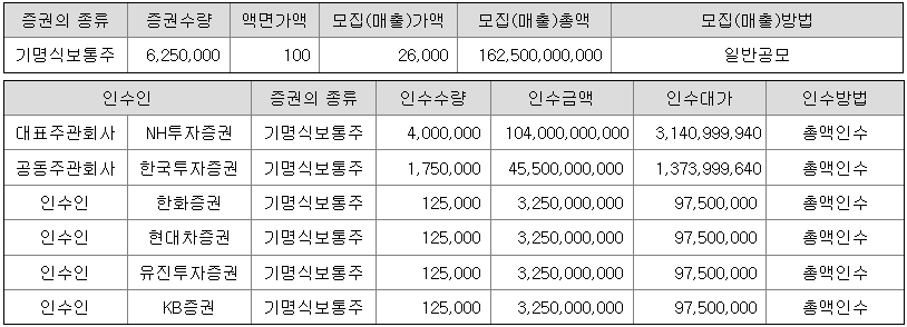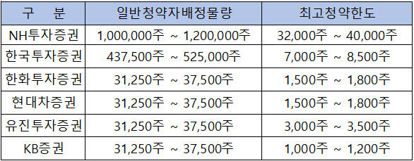 - 청약 가능 증권사 : NH투자증권, 한국투자증권, 한화투자증권,현대차증권, 유진투자증권, KB증권