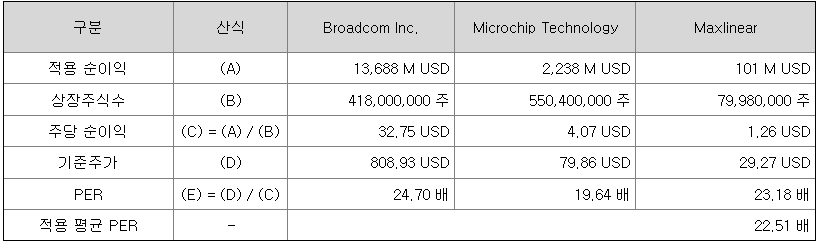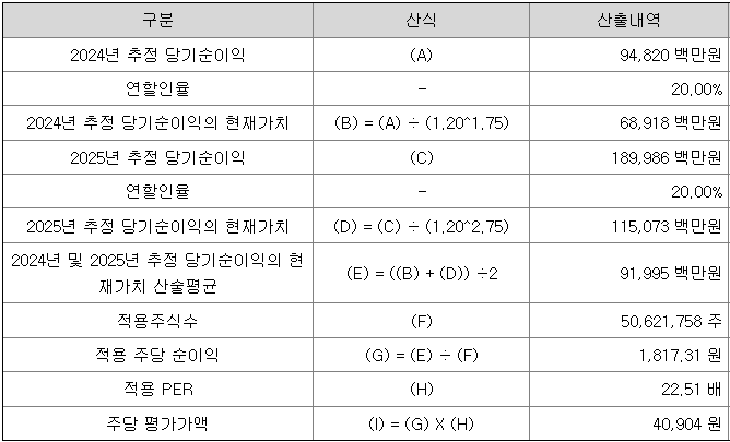주당 평가가액은 2024년과 2025년 추정 순이익을 현재 가치로 할인하여 환산한 후 주식 수로 나누어 주당 순이익을 구하고, 유사회사의 평균 PER배수를 곱하여 산출한 것입니다.