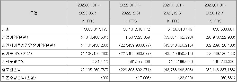 회사의 매출 실적을 보면 2022년의 매출 급신장이 눈에 들어옵니다만, 아직 적자 상태라는 점에서 미래 수익 추정에 대한 기관투자자들의 신뢰 확보 여부가 관건이라고 하겠습니다.