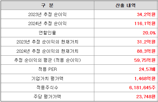 주당 평가가액은 2023년과 2024년의 추정 순이익을 현재가치로 할인하여 환산한 후, 유사회사의 평균 PER배수를 곱하여 회사가치를 정하고 이를 주식 수로 나누어 산출한 것입니다.