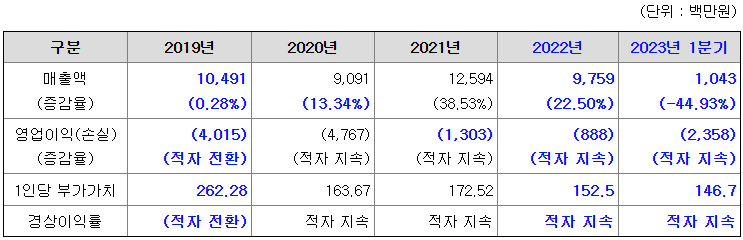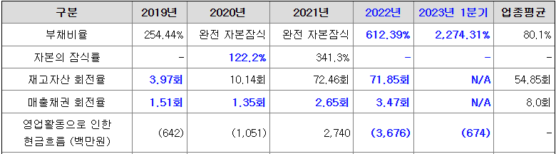 동사는 지속적 적자로 인해 자본 잠식 상태였다가 2022년 우선주의 보통주 전환으로 자본 잠식에서 벗어났지만, 아직 부채비율이 높은 상황입니다.