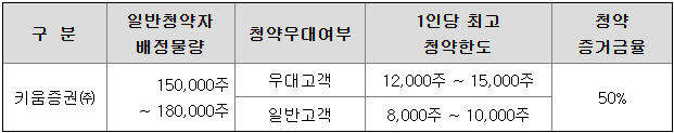 키움증권의 일반 청약자 배정 물량은 150,000주 ~ 180,000주이고, 일반 청약자의 최고 청약 한도는 일반 고객 기준 8,000주 ~ 10,000주입니다.