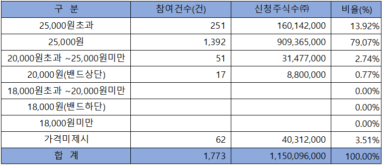 희망가격 상단 이상 신청 비율은 96.49%였으며, 확정 공모가 25,000원 이상 신청 비율도 92.99%에 달했습니다.