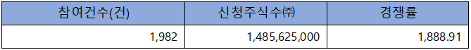 수요예측 참여 건수는 총 1,982건에 신청 주식수 1,485,625,000주로, 참여 경쟁률 1,888.91 : 1의 매우 좋은 실적을 기록했습니다.