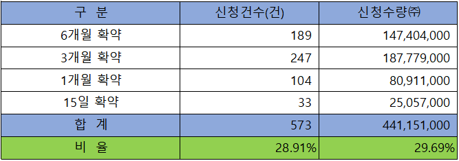 의무 보유 확약 건수는 573건에 441,151,000주로 전체 신청 물량 대비 건수로는 28.91%, 수량으로는 29.69%였으며, 그중 3개월 확약과 6개월 확약 비중이 높았습니다.