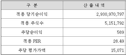 주당 평가가액은 2023년 3월 말 기준 직전 12개월의 순이익을 주식 수로 나누어 주당 순이익을 구한 다음 유사회사의 평균 PER배수를 곱하여 산출한 것입니다.