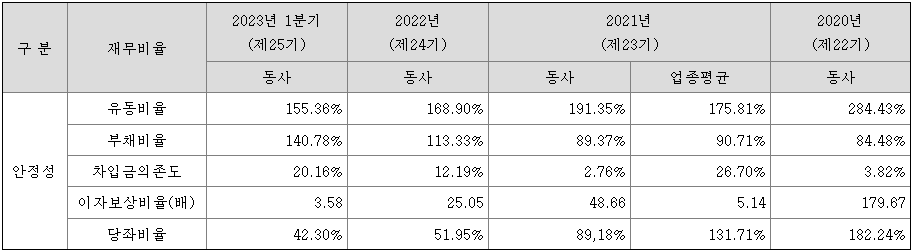코츠테크놀로지의 유동비율과 부채비율은 2022년부터 동업종 평균 대비 열위의 수치를 기록하고 있는데, 이는 코로나 사태로 반도체 수급 기간이 길어지면서 안전 재고 확보로 인한 것입니다. 2023년부터는 반도체 수급이 안정화에 들어섰기 때문에 정상화될 것으로 추정하고 있습니다.