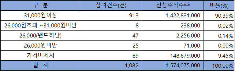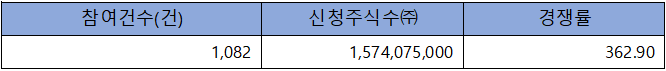수요예측 참여 건수는 총 1,082건에 신청 주식수 1,574,075,000주로, 참여 경쟁률 362.90 : 1의 보통 수준의 실적을 기록했습니다.