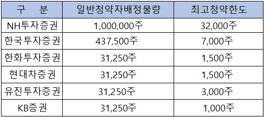 - 청약 가능 증권사 : NH투자증권, 한국투자증권 등 6개 증권사