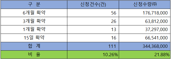 의무 보유 확약 건수는 111건에 344,368,000주로 전체 신청 물량 대비 건수로는 10.26%, 수량으로는 21.88%%였으며, 6개월 확약 비중이 제일 높았습니다.