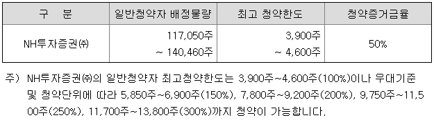 NH투자증권의 일반 청약자 배정 물량은 117,050주 ~ 140,460주이고, 일반 청약자의 최고 청약 한도는 일반 고객 기준 3,900주 ~ 4,600주입니다.