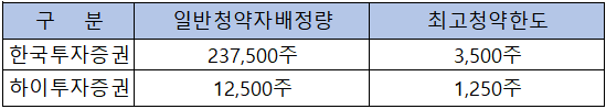 - 청약 가능 증권사 : 한국투자증권, 하이투자증권
