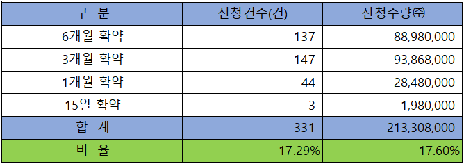 의무 보유 확약 건수는 331건에 213,308,000주로 전체 신청 물량 대비 건수로는 17.29%, 수량으로는 17.60%였으며, 3개월 확약과 6개월 확약의 비중이 높아 내용이 좋았습니다.