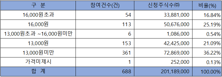 수요예측 참여 건수는 총 688건에 신청 주식수 201,189,000주로, 참여 경쟁률 191.61 : 1의 매우 저조한 실적을 기록했습니다. 희망 공모가격 상단 이상 신청 비율이 42.03%였지만, 하단 이하 신청 비율이 57.31%에 달해 이것이 희망 공모가를 끌어내리는 요인으로 작용한 것으로 보입니다.
