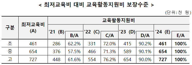2024년 교육활동지원비를 최저교육비의 100%수준으로 인상하여 지급합니다.