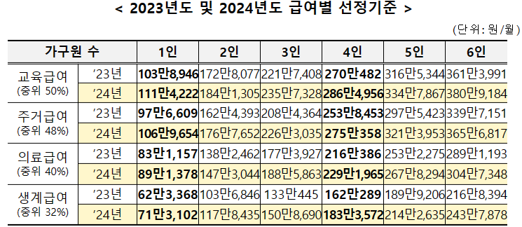 4인 가구 기준으로 급여별 선정 기준은 생계급여 183만 3,572원, 의료급여 229만 1,965원, 주거급여 275만 358원, 교육급여 286만 4,956원 이하이며, 가구원 수에 따른 급여별 선정기준은 아래 표와 같습니다.