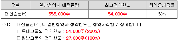 대신증권의 일반 청약자 배정 물량은 555,000주이고, 일반 청약자의 최고 청약 한도는 일반 그룹 기준 27,000주입니다.