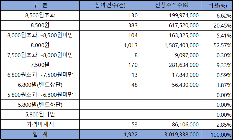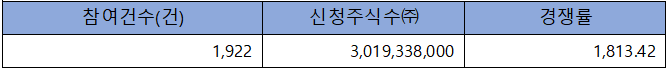 수요예측 참여 건수는 총 1,922건에 신청 주식수 3,019,338,000주로 참여 경쟁률 1,813.42 : 1의 매우 좋은 실적을 기록했습니다. 확정 공모가 8,000원 이상 신청 비율이 85.06%에 달해 공모가를 끌어올리는데 결정적 역할을 한 것으로 보입니다.